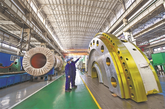 图为工人在哈电集团哈尔滨电机厂有限责任公司的生产车间作业。