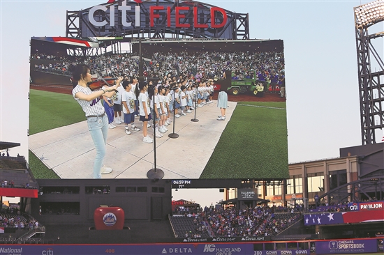 近日,在美国纽约大都会棒球队主场花旗球场,儿童合唱团在“中华之夜”暨“你好!中国”旅游推广品牌发布活动结束后表演。新华社记者 张凤国 摄