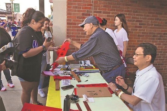 近日,在美国纽约大都会棒球队主场花旗球场举行的“中华之夜”暨“你好!中国”旅游推广品牌发布活动上,工作人员向观众赠送“墨宝”。新华社记者 张凤国 摄