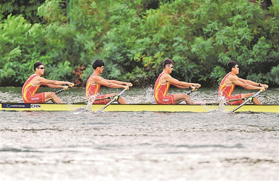 2023年赛艇世锦赛于9月3日至10日在塞尔维亚贝尔格莱德举行。图为中国选手李文雷、陈弦峰、徐桥、蔡鹏鹏(从左至右)在男子四人单桨资格赛中。