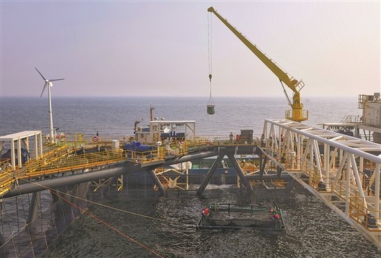 9月5日,位于渤海湾的长岛海洋牧场上的经海007号深海智能网箱,工作人员正在打捞海鱼。长岛是山东省烟台市海洋生态文明综合试验区,近年来,长岛深入实施海洋牧场“百箱计划”,全力将海上牧场打造成“蓝色粮仓”。本报记者 杨登峰 摄