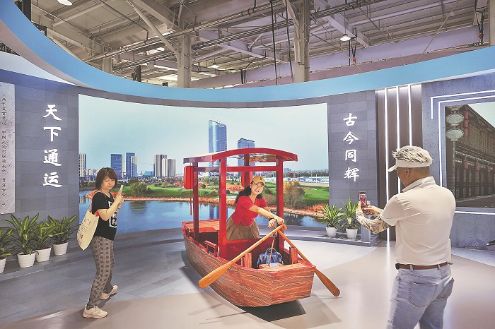 9月6日,在首钢园2号馆内“古今同辉 天下通运“为主题的通州展台,游客们在大运河景观前打卡留念。