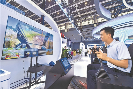9月7日,参观者在2023中国国际数字经济博览会上体验挖掘机5G远程驾驶系统。