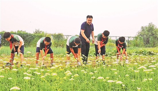 9月9日,在山东省乐陵市朱集中心小学劳动实践基地,老师指导学生上劳动实践课。新学期伊始,乐陵市落实“双减”政策,各中小学校开设丰富多彩的科普、文体、艺术、劳动等特色课后服务课程,丰富校园文化生活,促进学生德智体美劳全面发展。