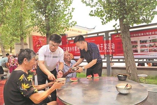 裴东鑫(左二)在付楼村举办的孝老孝亲饺子宴上给老人端饺子。受访者供图
