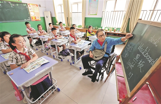 9月4日,在山东省枣庄市永安镇遗棠小学,杨季刚在教室给四年级学生上英语课。