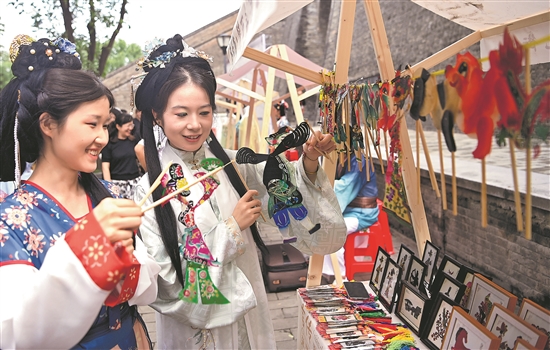 9月12日,陕西省西安市新城区“遇见城墙·非遗韵”非遗集市主题活动在西安城墙中山门下举办。秦腔、华阴老腔等特色非遗节目在永兴坊戏楼前轮番表演,皮影、布艺、工艺葫芦等20多种非遗作品在顺城巷内集中亮相。新华社记者 刘潇 摄
