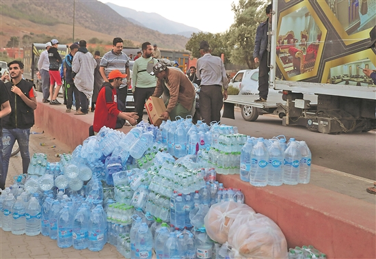 当地时间9月12日,救援人员在摩洛哥豪兹省的塔拉特恩雅库布搬运物资。新华社记者 王东震 摄