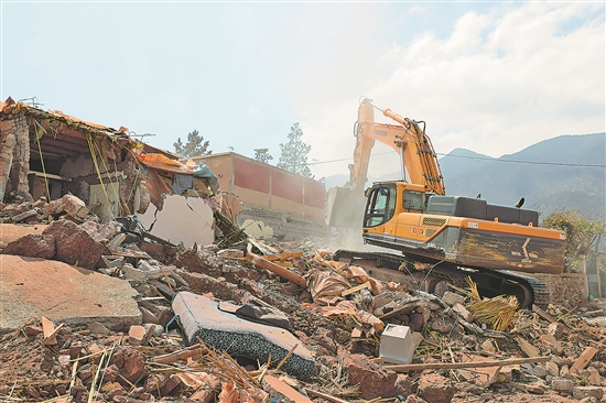 当地时间9月12日,一辆挖掘机在摩洛哥豪兹省的穆莱村清理废墟。新华社记者 王东震 摄