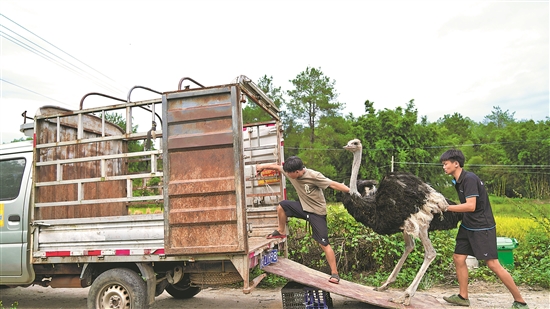 9月13日,吴锦彪和同伴将一只鸵鸟装车。