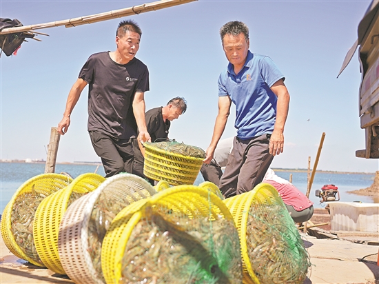 金秋时节,在河北省沧州市海兴县盐碱滩涂养殖池,养殖户正忙着捕捞对虾,一派繁忙景象。海兴县地处渤海之滨,土地盐碱化严重,种植效益差。近年来,当地依托盐碱滩涂搞起了特色水产规模化养殖,打造“蓝色粮仓”,目前已成为海兴县主导产业之一。