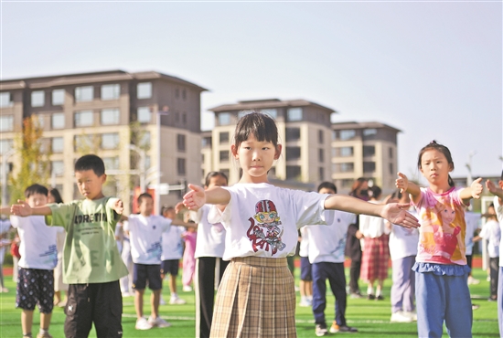 9月13日,雄安史家胡同小学学生在操场上做体操。2023年秋季新学期,雄安史家胡同小学迎来建成后首批138名新生。据悉,雄安史家胡同小学由雄安新区管理委员会负责属地管理并委托北京市东城区史家胡同小学开展办学和运营。