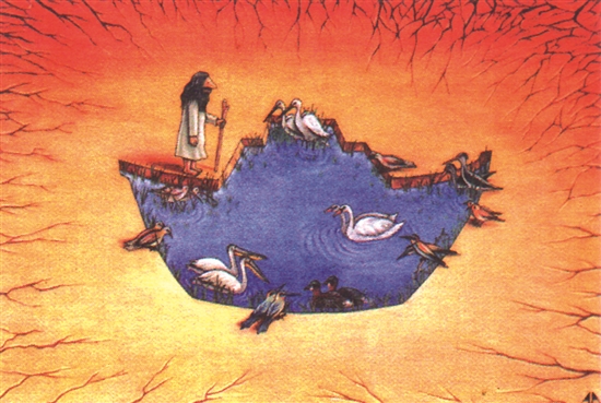 在干涸的池塘中,仅仅剩下这一潭清水,放牧人执着地守护着赖以生存的禽类,这正是现实生活水塘版的“诺亚方舟”。