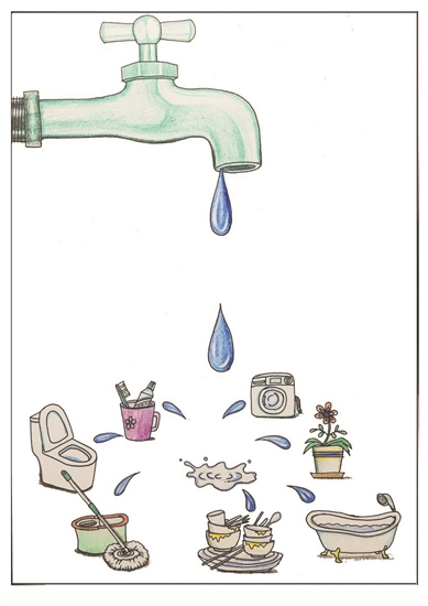 不看不知道,一看有门道。在仪海滨笔下,体积有些夸张的水龙头,精确地落下一滴水。当这滴水魔术般地化成7瓣,分别用来刷牙、用来洗碗、洗澡,洗衣,用来浇花、擦地板,用来冲洗马桶。这些个“用来”,都是我们熟悉的水的去处,事实上我们还可以列举很多,等待我们亲手去“掰”的机会也很多。