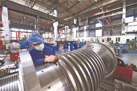 在哈电集团哈尔滨汽轮机厂有限责任公司的生产车间,工人在生产作业。