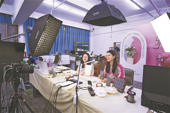 9月16日,浙江省诸暨市人社局工作人员戚涵(图左)走进华东国际珠宝城直播间调研并向主播学习直播技巧。本次调研旨在帮助解决主播工作中遇到的困难,构建良好的营商环境,增强年轻干部专业化服务能力。本报通讯员 何夏萍 方成 摄