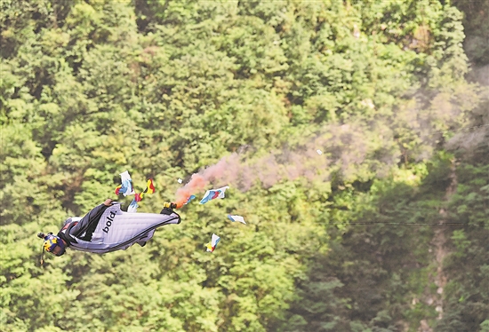 9月18日,中国选手张树鹏在比赛中击穿靶标,最终他获得季军,冠军由法国选手文森特·戴斯克获得。当日,第九届世界翼装飞行联盟(WWL)翼装飞行世锦赛精准穿靶赛决赛在张家界天门山举行。新华社发(邵颖 摄)