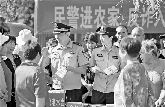 9月14日,在山东省临沂市郯城县郯城街道东南村,公安民警采取情景模拟的形式,为村民讲解如何识别诈骗分子的套路,提高群众识骗防骗能力,全力守护好群众“钱袋子”。