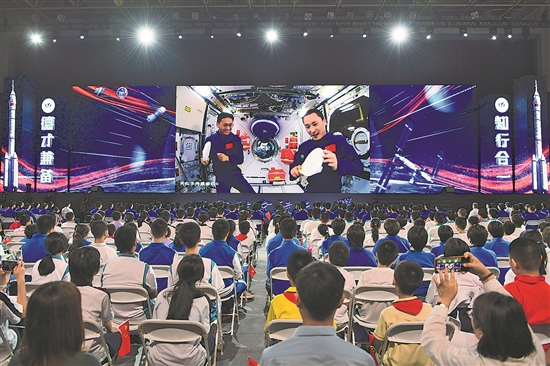 “天宫课堂”第四课在中国空间站正式开讲,神舟十六号航天员景海鹏、朱杨柱、桂海潮进行授课。3名航天员在轨展示介绍中国空间站梦天实验舱工作生活场景,演示球形火焰、奇妙“乒乓球”等实验。新华社记者 鞠焕宗 摄