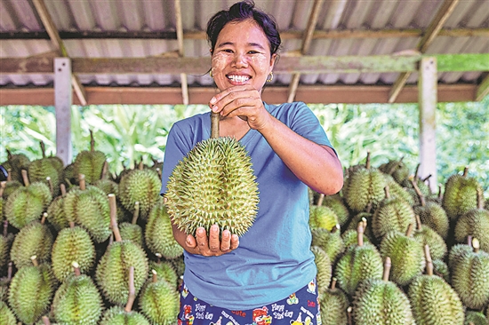 近年来,随着《区域全面经济伙伴关系协定》(RCEP)红利释放,中国—东盟自贸区建设深入推进,以及西部陆海新通道等一批互联互通项目的建设,中国—东盟贸易规模进一步扩大。今年前5个月,广西自东盟进口榴莲突破32.4亿元,同比增长516%。图为在泰国春蓬府一处果园内,工人在展示刚采摘的榴莲。