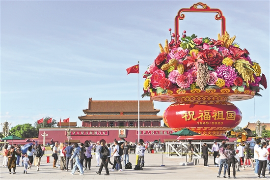 “祝福祖国”巨型花篮主体亮相天安门广场