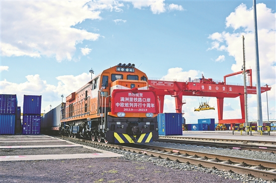 作为我国向北开放的“桥头堡”、中欧班列“东通道”的重要口岸,满洲里铁路口岸不断加大中欧班列通道能力建设,进一步提升运输效率和品质。10年来,满洲里铁路口岸中欧班列通行量实现连年增长,助力满洲里加速向北开放。新华社记者 李志鹏 摄