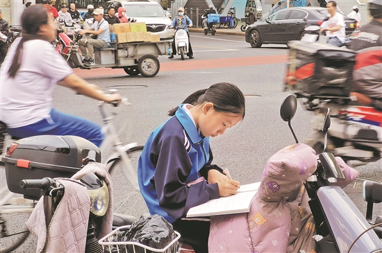 9月19日,下班高峰期,北京西城区的街道上车流不息。一名中学生趁父亲买菜间隙,坐在电动车上认真写作业,丝毫不受周围嘈杂环境的影响。
