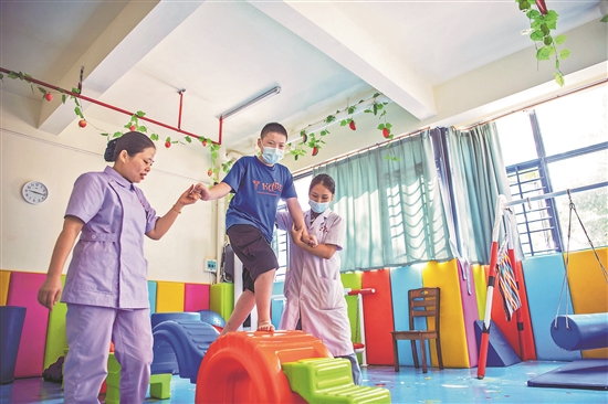 9月21日,残障儿童在江西省赣州市兴国县一家残障儿童康复中心进行康复训练。该中心是集康复、医疗、教育为一体的残障儿童康复治疗机构,用医康教融合的方式为残障儿童提供各类康复治疗。