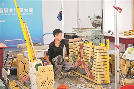黄睿强在赛场进行砌筑操作。本报记者 史宏宇 摄