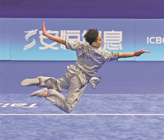 9月24日,杭州亚运会武术男子长拳项目决赛中,中国选手孙培原获得金牌。图为孙培原在比赛中。本报记者 窦菲涛 摄