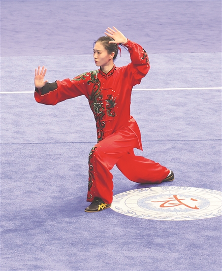 9月24日,在杭州亚运会武术女子太极拳太极剑全能项目决赛中,中国选手童心获得金牌。图为童心在比赛中。本报记者 窦菲涛 摄