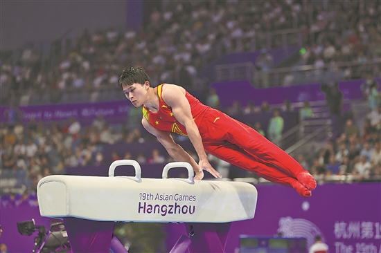 9月24日晚,在杭州亚运会体操男子团体决赛中,中国队夺得冠军。图为中国队选手林超攀在鞍马比赛中。本报记者 吴凡 摄