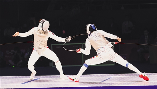 9月24日晚,在杭州亚运会男子个人花剑金牌赛中,中国香港选手张家朗(左)夺冠,中国选手陈海威(右)获得银牌。本报记者 窦菲涛 摄
