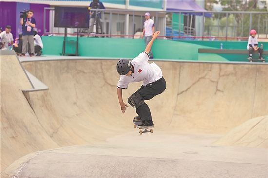 9月25日,在杭州亚运会滑板项目女子组碗池决赛,我国选手李玉娟、毛嘉思分获银牌和铜牌。图为毛嘉思在比赛中。本报记者 吴凡 摄