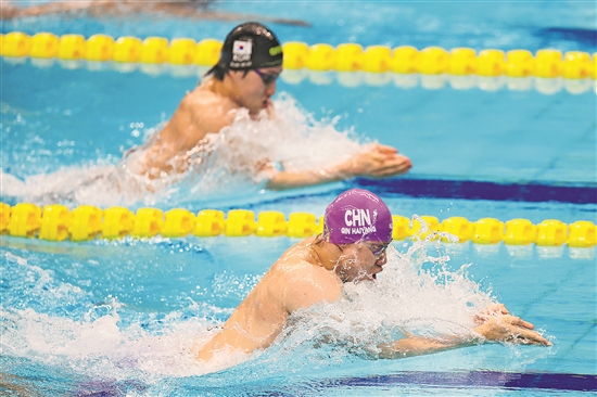 在9月25日晚结束的杭州亚运会男子100米蛙泳决赛中,新科世锦赛冠军覃海洋(紫帽者)以57秒76的成绩收获金牌,继预赛之后再次刷新亚运会赛会纪录。另一名中国选手闫子贝拿下银牌。