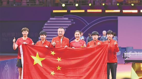 9月26日,中国队获得杭州亚运会乒乓球女子团体金牌。本报记者 窦菲涛 摄