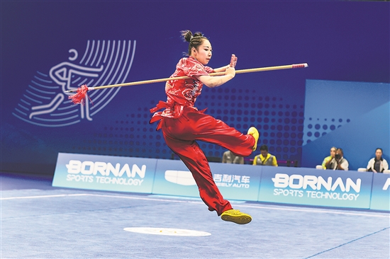 9月27日,在杭州亚运会武术女子剑术枪术全能项目比赛中,中国选手赖晓晓获得金牌。图为赖晓晓在女子枪术决赛中。本报记者 吴凡 摄