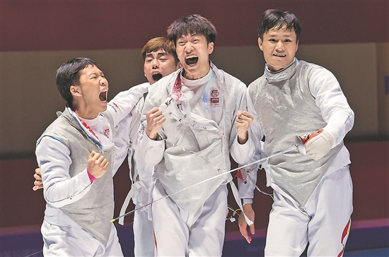 9月27日,中国队赛后庆祝胜利。当日,在杭州亚运会击剑项目男子团体花剑半决赛中,中国队以45比44战胜日本队,晋级决赛。新华社记者 徐昱 摄