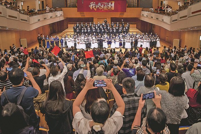 10月1日,毗邻天安门广场的北京音乐厅歌声嘹亮、掌声如潮——“我和我的祖国”大型主题合唱音乐会火热上演。音乐厅的黄金位置留给了劳动模范,用歌声赞美劳动模范、赞美劳动者。本报记者 蔚可任 摄