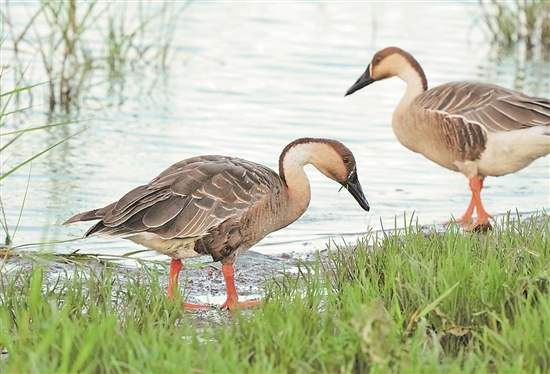 近日,大批迁徙候鸟飞抵河北省秦皇岛市北戴河区沿海湿地觅食、停留,出现万鸟临海场景。图为两只鸿雁在北戴河区沿海湿地觅食。