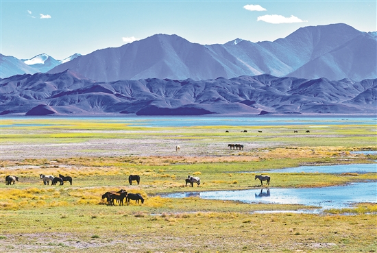 班公湖位于西藏阿里地区日土县西部,湖面平均海拔4200米。它的奇特之处在于,由东向西水中含盐量递增,湖水在阳光下呈现墨绿、淡绿和深蓝等不同的颜色。这里碧波荡漾,水草丰美,是名副其实的西陲明珠。