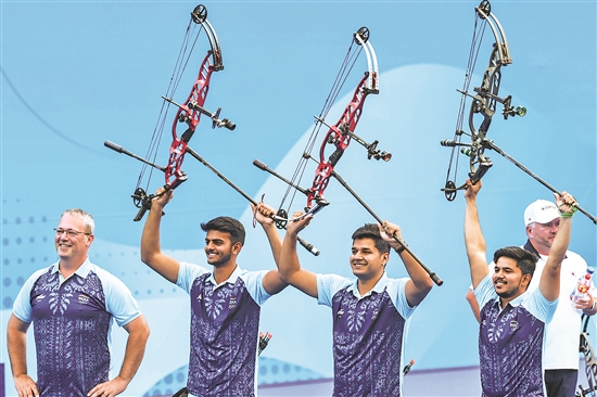 10月5日,在杭州富阳银湖体育中心举行的杭州亚运会射箭项目男子复合弓团体比赛中,印度队(上图)获得金牌,韩国队获得银牌,马来西亚队获得铜牌。