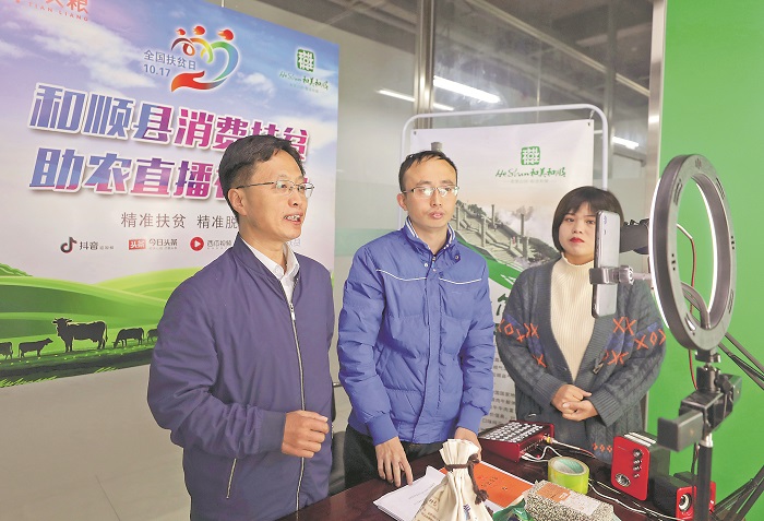 2020年10月12日,全国总工会驻山西省和顺县定点帮扶工作队的工会干部贾海涛(左一)在网上“直播带货”,推介和顺扶贫农产品。本报记者 杨登峰 摄