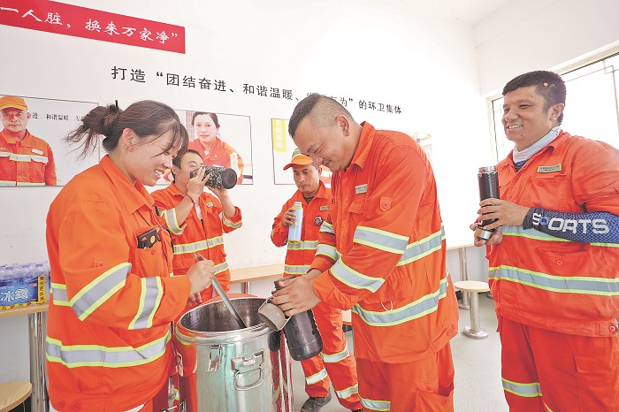 2023年7月5日上午,北京市东城区,环卫工人在工会驿站内盛绿豆汤消暑解渴。本报记者 刘金梦 摄