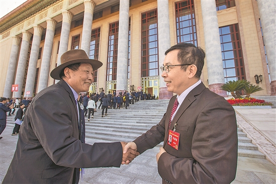 10月8日,在北京人民大会堂门前,韩卫华代表和洛松群培代表重逢。本报记者蔚可任 摄