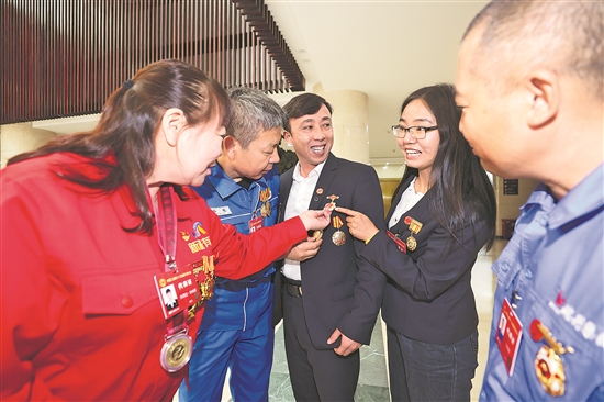 10月10日上午,在新疆维吾尔自治区代表团讨论会间隙,热西拉·热哈提、薛魁、赛福丁·伊斯热依力、兰彩英、万书宏(从左至右)等5位来自一线的劳模代表聚在一起,互加微信。兰彩英得知身边的几位代表都曾获得过全国五一劳动奖章时,表示要向他们看齐。