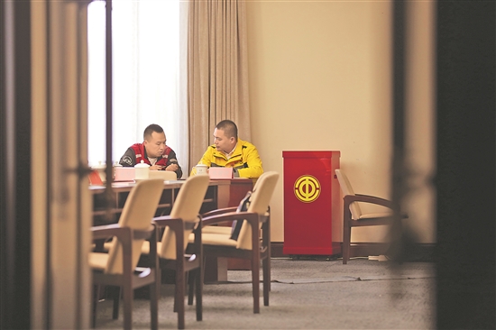 10月10日下午,宁夏回族自治区代表团讨论会现场,离会议开始还有20分钟,两位快递小哥朱静涛(图右)代表和马平代表早早来到会场等候,他们说这是职业习惯,就像希望把每一件包裹尽早送到客户手中一样。