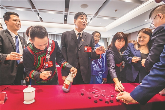 10月10日,北京,中国工会十八大山西代表团讨论会结束后,赵瑞昌代表(左三)拿出产自晋中市和顺县的老陈醋请大家品尝。作为晋中市总工会党组书记、常务副主席,他表示,在全国总工会各部门、各有关直属单位的“组团式”支援下,和顺陈醋等地理标志产品销路得以拓宽,还促进了当地剩余劳动力就业。