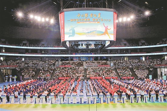 ④7月24日,“中国梦·劳动美——团结奋斗开新局 喜迎工会十八大”2023年全国职工羽毛球大赛开幕式现场。