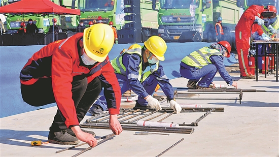 ⑤3月21日,新疆交通运输厅2023年“丝路交通杯”全国引领性·主题劳动和技能竞赛启动,图为钢筋绑扎项目竞赛现场。